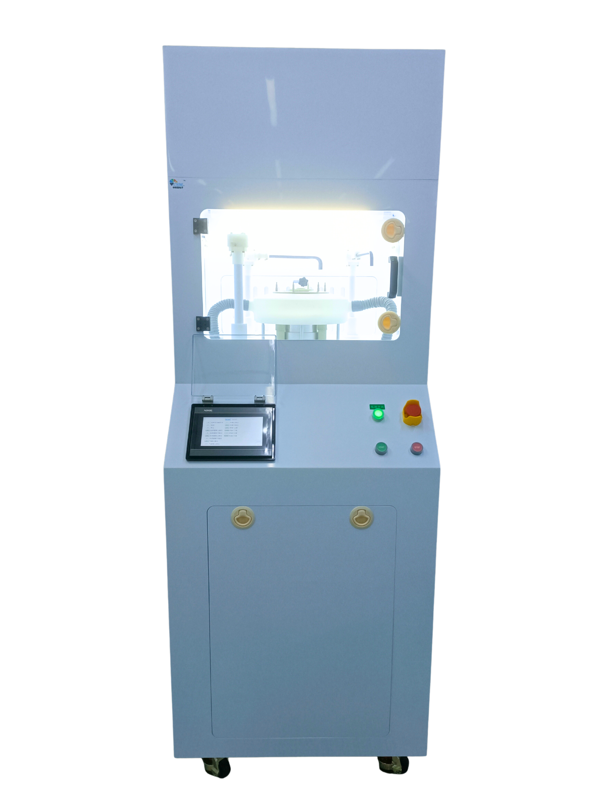 單片清洗甩干機主要伺服電機,PLC控制器,人機界面,高潔凈閥門,PFA管,氮氣加熱器,防腐蝕進口PP外殼,以及甩干頭部分組成。